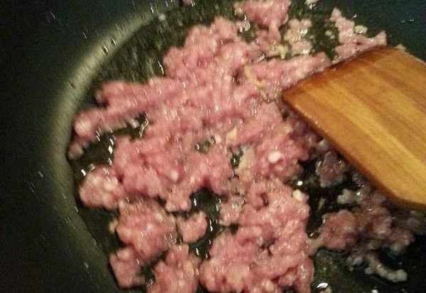 接下來要做肉末,將鍋裡倒入適量的油,將之前切好的肉末倒入鍋中,不斷翻炒;當肉末出現變色後,將肉末撈出備用。然後再放入切好的蔥薑蒜末,一起煸炒,炒出香味後在鍋裡倒入1湯匙醬油、食鹽以及白糖,再放入半碗清水後不斷的翻炒,炒出香味後擺在盤子裡備用。