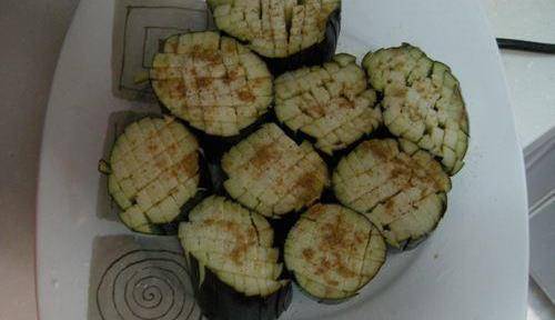 首先要買好的茄子洗凈,切去茄子蒂;再用刀將茄子切成薄厚均勻的茄子墩,也就是像木墩那樣;然後在茄子的切面用刀劃幾個口,大概就是切成3*3的網格狀就行可以。如下圖所示:然後要在鍋裡倒入適量的油,將油熱至三四成即可;接下來下入切好的茄子墩,用小火煎制;當茄子的兩面都出現綠色,而且=逐漸出現金黃色就可以將茄子撈出控油備用瞭。