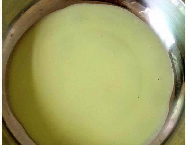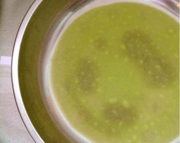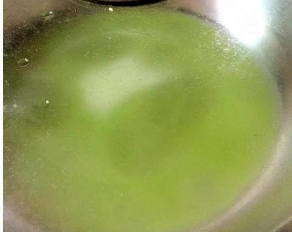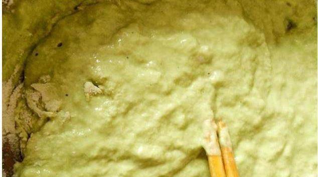 取一個幹凈的盆子,把高精面粉和紅薯淀粉混合,放入盆中,直接把打好的西瓜皮汁過濾到瞭面粉裡,用筷子攪拌