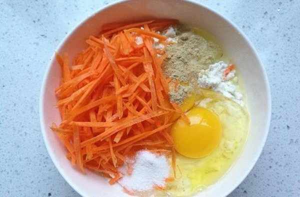 面粉碗裡打入2顆雞蛋,擦成細絲的胡蘿卜,放入1勺鹽、1小勺胡椒粉、1小勺雞粉,再加入適量水混合攪拌均勻。