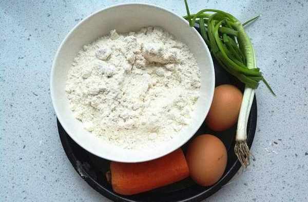 這早餐專為懶人媽媽準備,5分鐘讓孩子吃上有營養的早餐,非常簡單。首先來準備食材,2個雞蛋、一碗面粉、2根小香蔥、半根胡蘿卜、清水適量、鹽1勺、胡椒粉1勺、雞粉1小勺