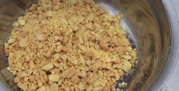 【步驟二】炒熟的花生米一把,放在石臼裡,將花生搗成花生碎,不要搗得太碎瞭,要有一點顆粒感,搗碎之後放在盆中。