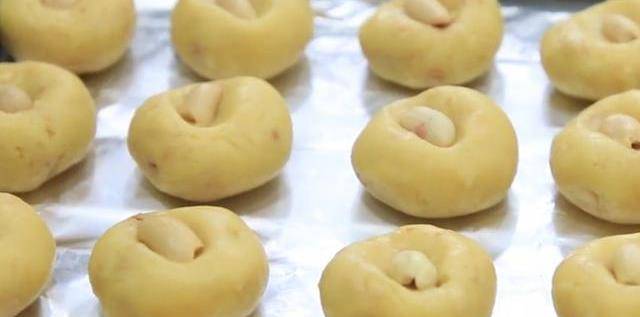 【步驟五】接著加入少量低筋面粉,和成偏軟一點的細膩面團,然後將烤盤取出,上面鋪上錫紙或者油紙,然後將面團分成小劑子,用手團圓之後,再按扁,然後在小餅中間,用拇指按一個小窩,窩裡放上一粒花生。這樣一個生坯就做好瞭。