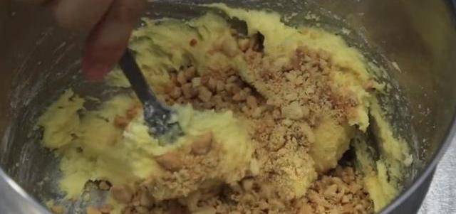 【步驟四】打成糊狀之後,再加入低筋面粉70克,接著倒入少量的煉乳,用勺子從底部往上翻,不要順著一個方向打圈,面粉容易出現筋性,翻勻之後,就倒入花生碎,繼續翻拌。