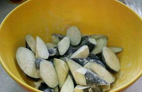首先我們先將茄子清洗幹凈,然後切成滾刀塊,放入盤中,裡面加入淀粉,攪拌均勻,一定要保證每塊茄子上面包裹上一層淀粉。之後再準備一個幹凈的盆,裡面加入面粉,同時再加入適量的水,攪拌成糊狀之後,將包裹上淀粉的茄子表面上再包裹上一層面粉。