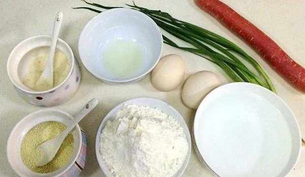 準備好這些食材之後,先把食材都清洗幹凈,然後把胡蘿卜去皮,切小塊,然後把蔥切成蔥花,放在一邊備用,再用一個幹凈的碗,加入適量的面粉和一點點水,攪拌均勻,盡量做的稀一點,然後再加入兩個雞蛋,攪拌均勻,大概三分鐘左右之後,加入之前準備好的蔥花和胡蘿卜,然後攪拌一下,再倒入一點點雞精,一湯匙食用鹽,攪拌均勻之後,放在一邊備用,平時你喜歡吃什麼的話,也可以在裡邊加一點,比如加一點香腸,味道也是非常好吃的。之前我還添加過一點點五花肉,味道也非常的不錯。剛開始制作的步驟大概都是這樣。