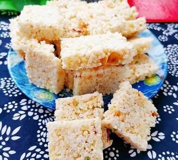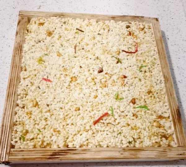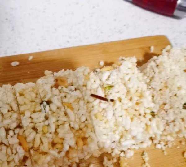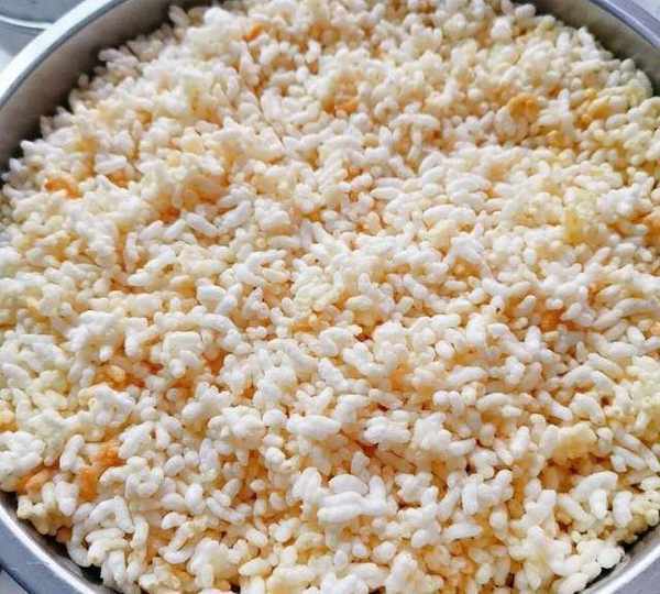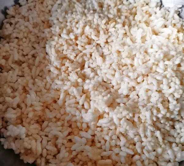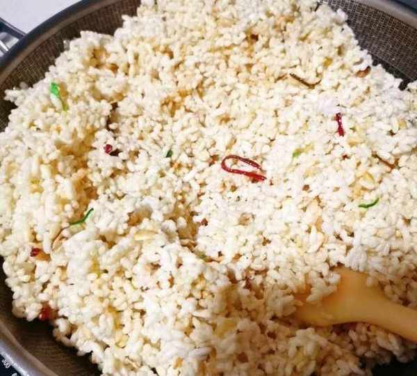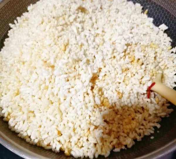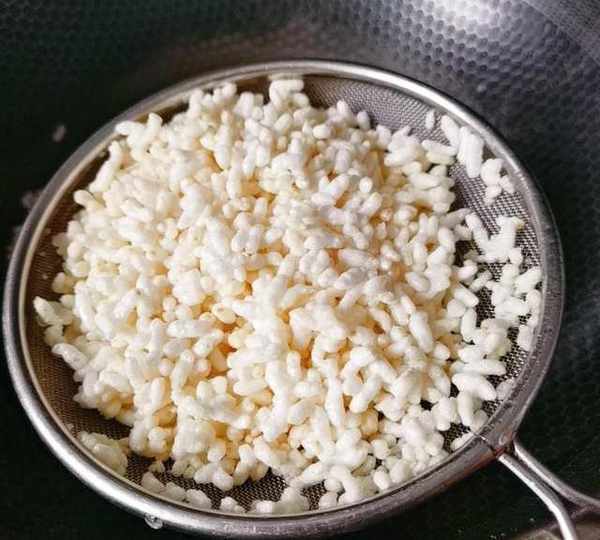 第5步、起鍋燒油,油七成熱時,分次下入凍米炸成米花。
