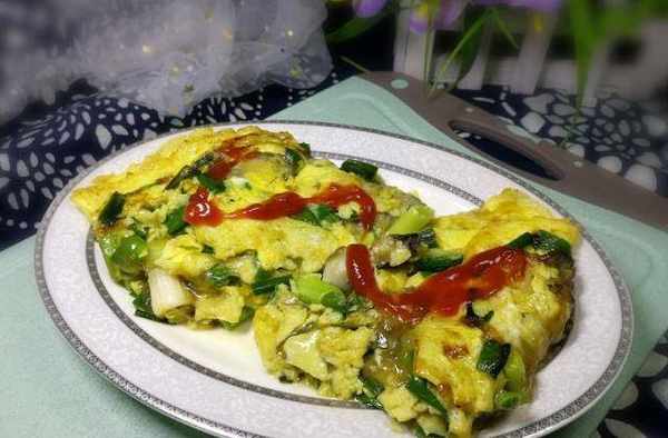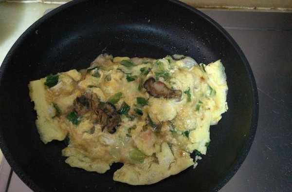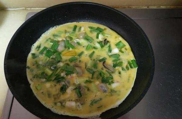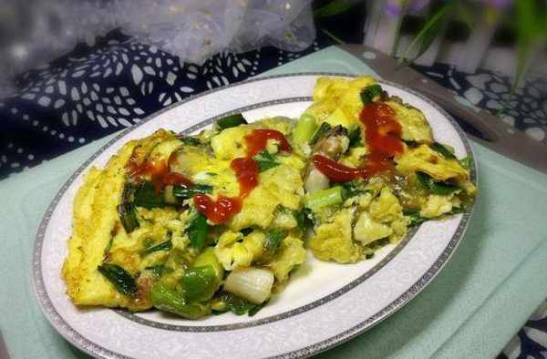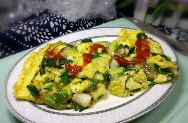 【食材】海蠣子肉100克、雞蛋3個、番茄醬適量、紅薯粉兩小勺、蒜苗100克、調和油10毫升、鹽少量
