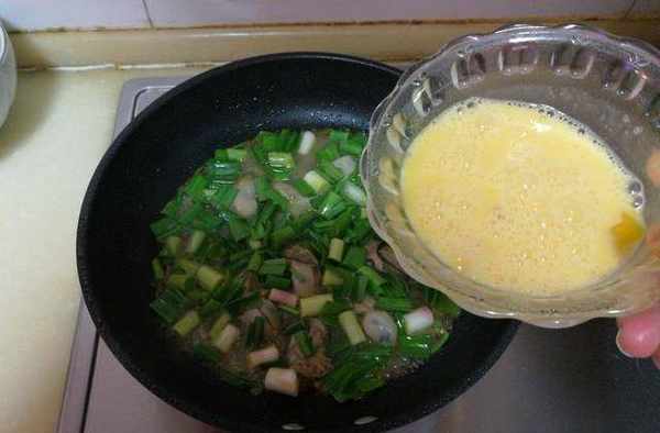 7、將雞蛋液轉圈均勻倒入鍋中,小火煎至蛋液凝固;