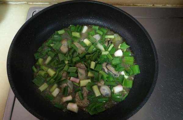 5、待紅薯粉逐漸凝固時放入切好的蒜苗,要將蒜苗均勻散開放入;