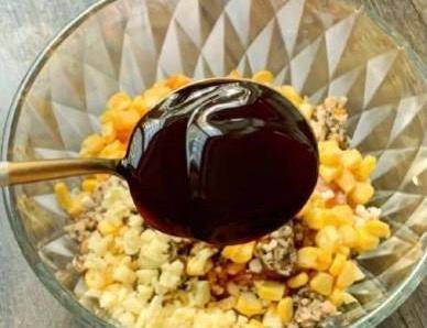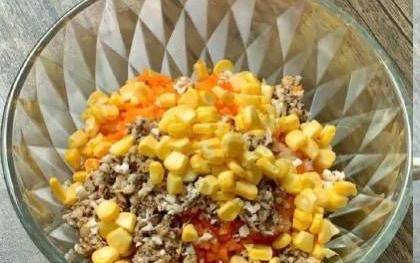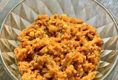 第三步:取一個大碗,裡面放入切好雞胸肉碎,加入胡蘿卜碎,香菇碎,新鮮玉米粒