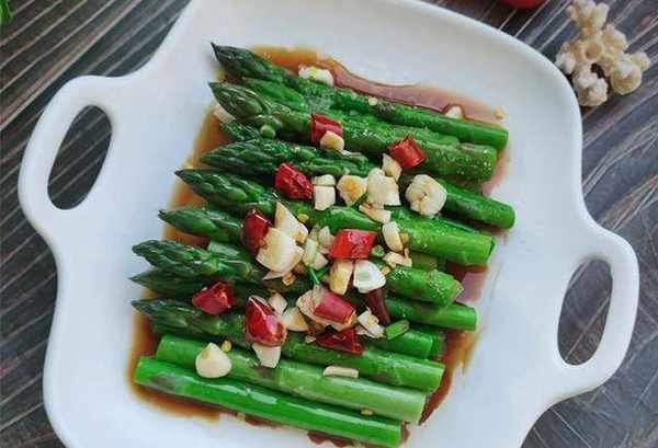 蘆筍適量、蒜末適量、幹辣椒適量、花生油適量、鹽適量、涼拌菜醬油適量。