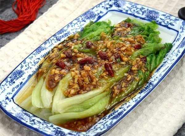 2、生菜撈出控水,擺入盤中。