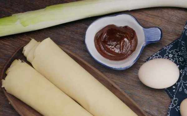 【準備原料】:雞蛋四個,大蔥碎少許,20cm×20cm的豆皮5張,甜面醬兩勺。