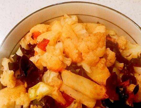 木耳番茄燒花菜:花菜洗凈,切成小朵備用,番茄洗凈,切成小塊,木耳泡發,洗幹凈。熱鍋冷油,炒木耳和番茄,加入花菜炒。加合胃口的生抽,辣油,翻炒即可。這道菜香氣撲鼻,好吃到舔盤子!
