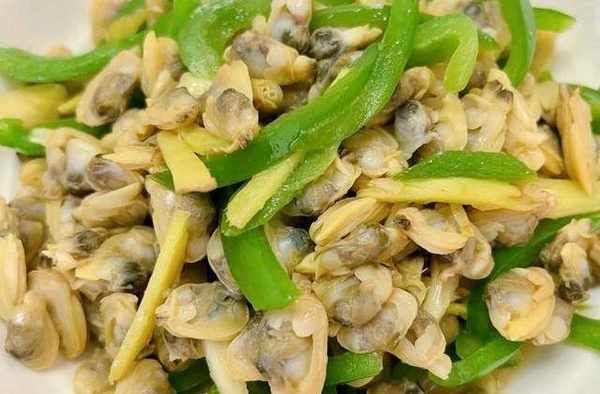 2.起鍋燒花生油,油熱下薑絲和蒜末爆香,再倒入切好的青椒絲翻炒幾下,然後把花甲肉倒入,大火翻炒。