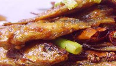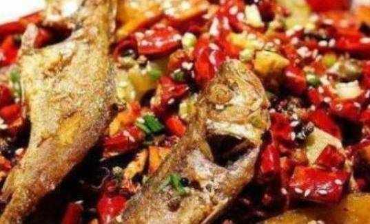 3、熱鍋放油,油燒至6成熱,下一條鯽魚,用文火浸魚肉,變成魚骨仙貝,撈出裝盤,澆上上桌的麻辣味汁,冷卻後即可食用。
