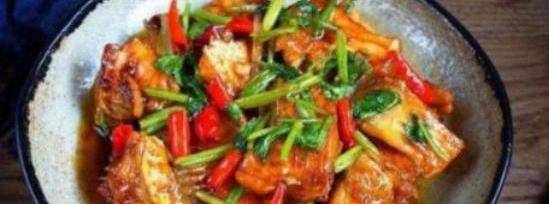 2、平底鍋倒油,魚段沾淀粉,入煎成金黃色;將煮好的魚汁放入鍋中,蓋上鍋蓋煮,就可以出鍋瞭。