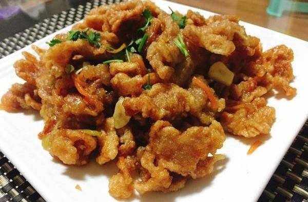 鍋包肉:把肉洗凈切片,用1克鹽和5ml料酒醃制二十分鐘,把100克土豆淀粉倒入碗中,清水泡二十分鐘以上,胡蘿卜,香菜和蔥薑分別切絲,蒜切片備用,二十分鐘以後清水會浮在淀粉上,將清水倒掉,將泡透瞭的淀粉全部抓進肉中裹勻,坐鍋倒油,加熱至七成,將肉片一片片下入鍋中炸,把炸好的肉放入碗中,將油倒出,加入白糖米醋和一克鹽中火熬至汁有些黏稠,隨後倒入所有的調料絲翻炒幾下,開大火,倒入肉塊快速掛汁出鍋。