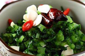 3.把芹菜葉子稍攥擠一下水,切小細料放盆裡,再放入杏仁、蒜茸、少許鹽、香油、醋,拌一下即可。