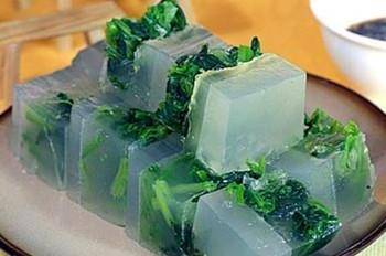 5.大飯盒刷上一層香油,倒入一半的湯汁,放入冰箱冷藏2小時後,將冷凍的菠菜取出倒在肉皮凍上,倒入剩餘的湯汁,放入冰箱冷藏一夜,取出皮凍切塊;調制碗汁:薑末少許,醋15克,醬油5克,蘸食即可。