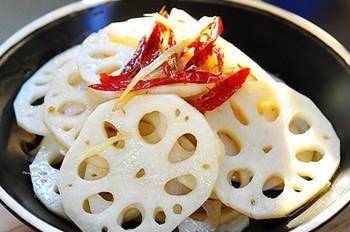 原料:鮮藕250克、幹紅椒5顆、薑絲10克、香麻油1大匙、沙拉油1大匙、香醋2大匙、砂糖1大匙、細鹽1/2小匙