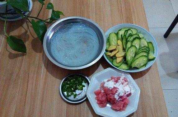 先用開水把粉絲燙上(不放粉絲就請忽略這一步);接著把豬肉用溫水洗凈,切肉片,加少許淀粉和一丟丟清水,抓勻;黃瓜搓洗幹凈切片,老薑也洗凈切薑片,跟黃瓜片放一起(方便一同下鍋且可以少洗一個傢什……);小蔥去根洗凈切蔥花。註:做這些準備工作的時候,可以先用小火把煮湯的水燒上瞭。