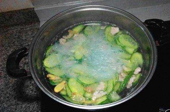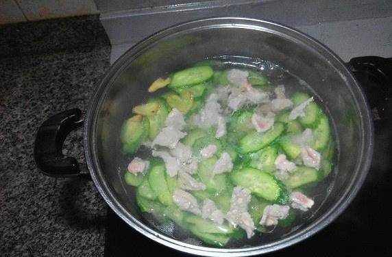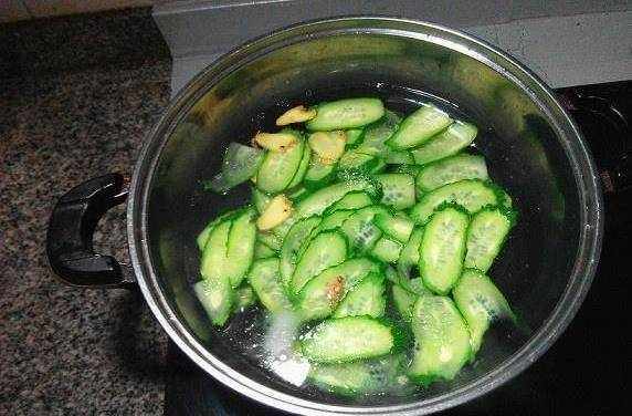 水開,下黃瓜片和薑片,再倒一點點食用油(或豬油)。