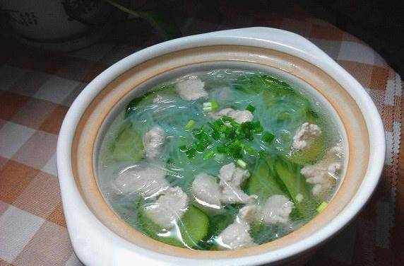 再次開鍋後小煮片刻,就可以下粉絲瞭,開起來後,加適量鹽和少許雞精,攪勻,關火。粉絲具體煮制時間,還是要看你買的粉絲經不經煮和你喜歡什麼樣的口感。我買的這個粉絲,經開水燙軟後,再下鍋滾一滾,就可以撈瞭,這時候的口感正是我喜歡的:利索,爽滑。另:黃瓜不要煮軟瞭,軟瞭不好吃。