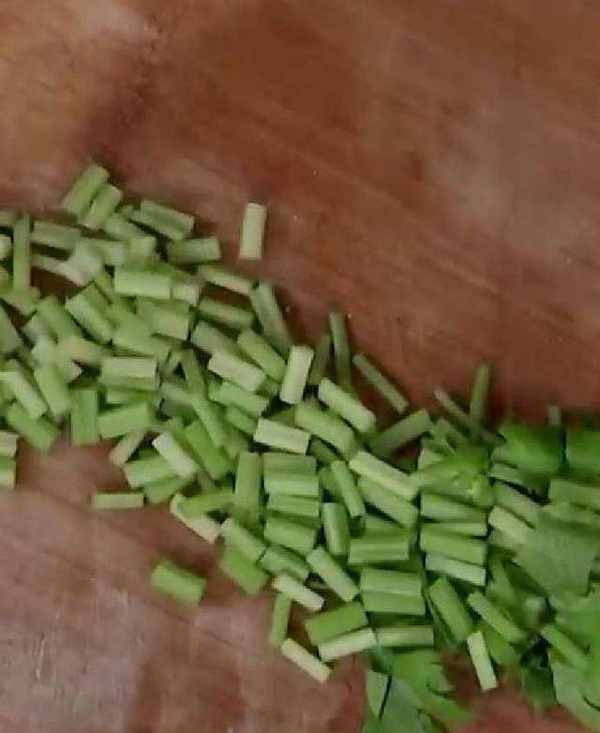 1、小香芹洗凈,改刀成小段;胡蘿卜先改刀成片,再改刀成與芹菜等長的小段;木耳泡發後改刀成小塊;鮮香菇改刀成段;大蒜改刀成末;