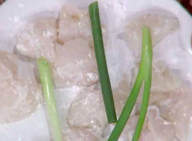 3、將龍利魚改刀成大小合適的塊放入容器中,加入少量的料酒,適量的鹽攪拌均勻;在撒入少量糯米粉拌勻,放入蔥段;