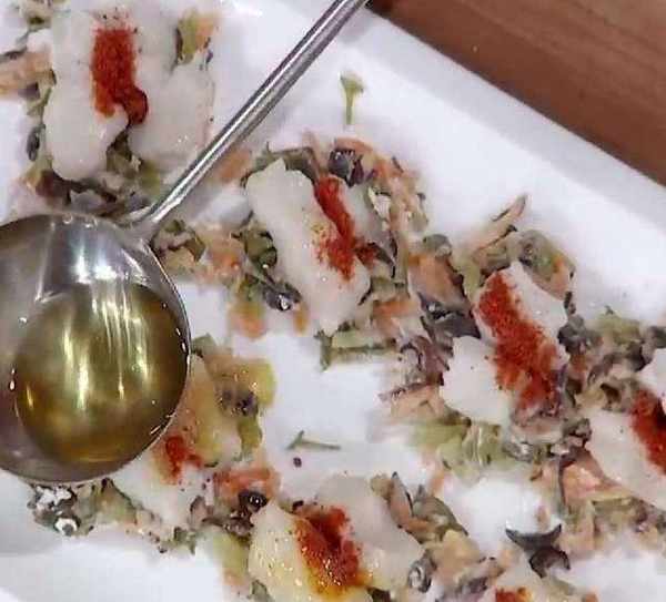 5、將蒸好的食材取出,先將蔬菜在盤中鋪底,再將蒸好的魚肉分別擺在蔬菜上面;取適量將辣椒面、蒜末分別放在魚肉上面;