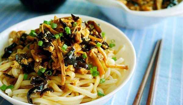 1.黃花菜,香菇泡發,青菜洗凈摘取老梗,蔥,薑切粗絲兒,豬肉化開切絲兒備用,