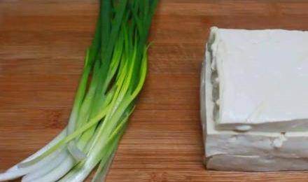 在制作美味的傢常豆腐之前,首先準備一塊新鮮的豆腐,然後再準備一小把香蔥。食材準備好之後,首先把豆腐清洗幹凈切成厚度和寬度在一乘以兩厘米左右的方塊狀,切好之後裝入一個幹凈的大盤子中備用。接著把香蔥清洗幹凈,放在案板上切成蔥花備用。