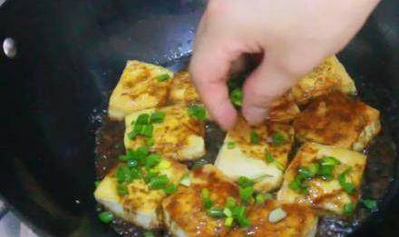 下面再另外起鍋,往鍋中倒入少許食用油大火燒開,等油溫上來後把豆腐下入鍋中進行油煎。煎至一分鐘左右翻上一面再次油煎。看到兩面煎至金黃之後,把事先調好的料汁澆淋在豆腐上面,然後再撒上蔥花即可出鍋裝盤。這樣簡單美味的傢常豆腐新吃法就制作完成瞭。