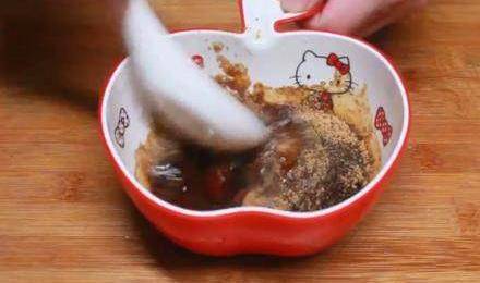 接下來準備一個幹凈的碗進行調料汁。首先往碗裡加入一勺五香粉,半勺孜然粉,兩勺蠔油,一勺生抽,一勺醬油攪拌均勻放置一邊備用。