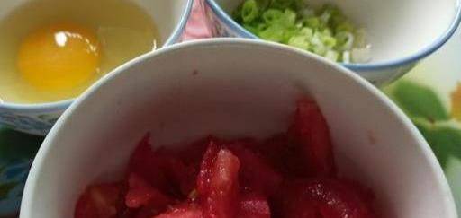 第一步,將西紅柿、小蔥、雞蛋洗凈,西紅柿去皮切薄片,小蔥切蔥花,雞蛋打入碗中打散備用;