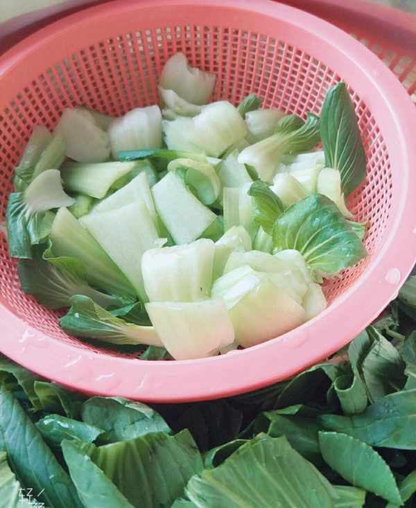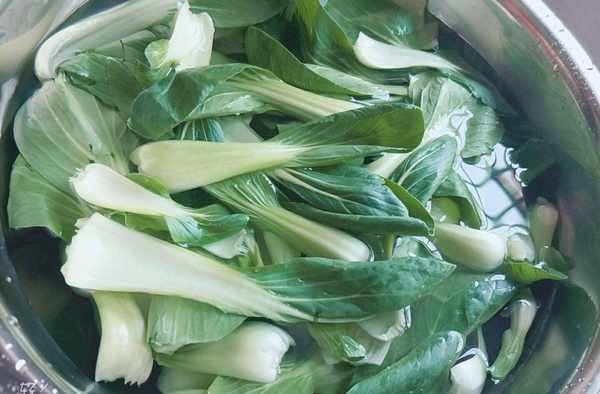 1:首先,將買回來的小青菜,用冷水浸泡10分鐘左右。(部分小青菜可能會有農藥的殘留物)
