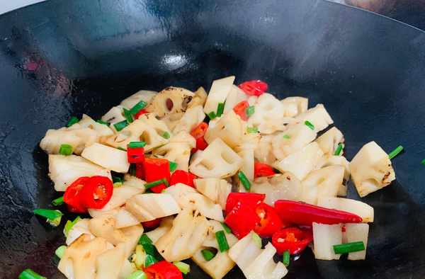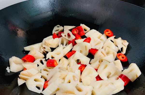 鍋熱倒入適量的油,先把紅椒大火爆香,再加藕丁開中火翻炒片刻。