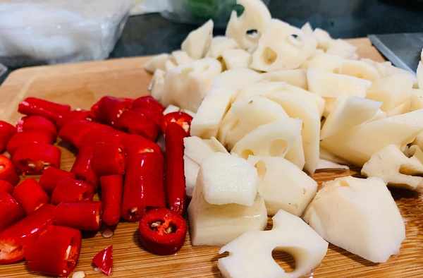 紅椒切圈,藕定去皮洗凈切小塊,藕切好塊要及時放入菜籃裡加水多洗幾遍,沖出多餘的淀粉後依然要泡水裡,這樣不會氧花且炒出來瞭藕丁脆甜。