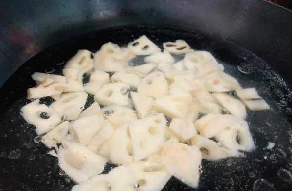 藕丁不要下過直接炒,以免炒得時間太長,吃起來不清脆。先焯水特別重要。水開要加鹽和油,再把藕丁倒入鍋中焯水一分鐘撈出瀝幹水分。這樣藕就會保持原來本身的顏色。