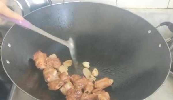 炸好後在鍋中先放入大蒜和生薑片,將大蒜和生薑片先炒一下,炒好後在加入花椒和八角,在和排骨一起翻炒,炒四十秒左右加入料酒,食用鹽,生抽
