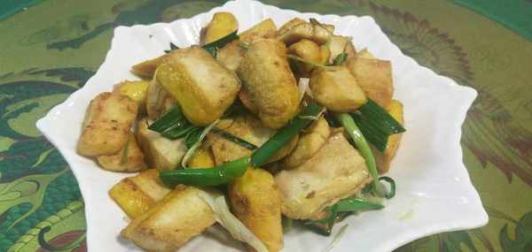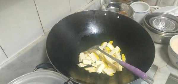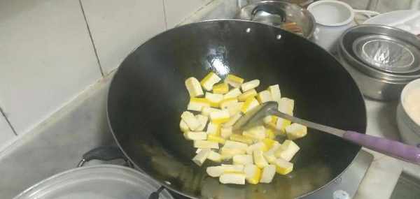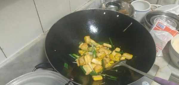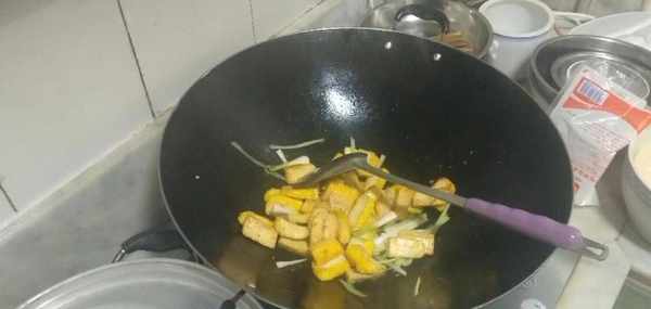 油開後在鍋中先加入豆腐幹,先翻炒三十秒左右,然後加入食用鹽,接著翻炒三十秒左右
