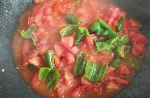 第三步,待青椒稍焉出味,倒入備好的西紅柿翻炒。