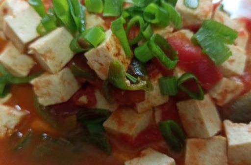 第五步,加入豆腐,拌勻後蓋鍋,煮3分鐘,加適量食鹽調味,即可出鍋,再撒上蔥花,營養美味的西紅柿青椒燒豆腐就上桌瞭。