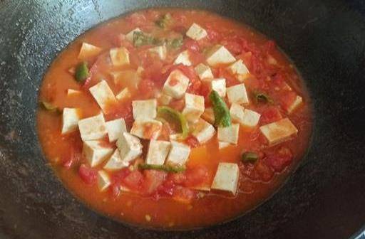 第四步,西紅柿出汁,加豆腐,加十三香調味,攪拌均勻。