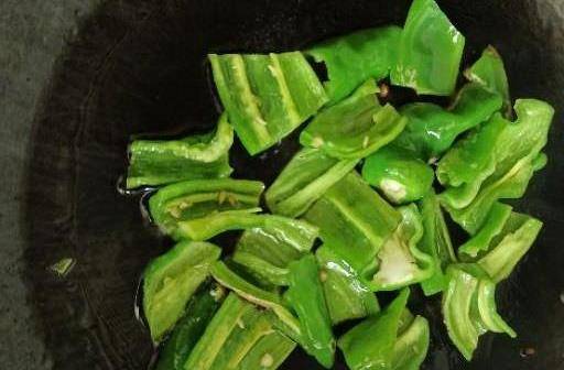 第二步,坐鍋打火,倒入適量食用油;油熱放青椒翻炒;