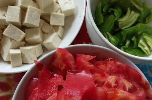 第一步,西紅柿、青椒、豆腐各適量,洗凈,西紅柿去蒂切小塊,青椒去籽切小片,豆腐切小丁備用。