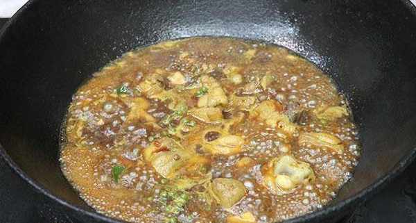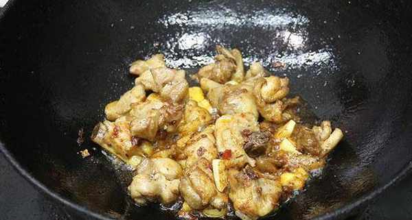 第五步:把鍋燒熱加入少許油,下入薑蒜粒,煸炒出香味後下入一勺豆瓣醬,炒出紅油後再下入炸好的雞塊,翻炒均勻。