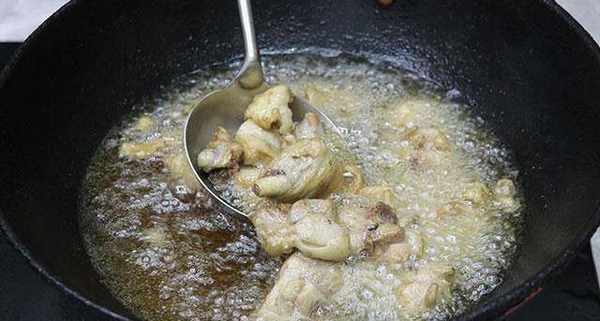 第四步:把鍋充分燒熱後加入油,待油溫燒至五成熱下入醃制好的雞塊,把雞塊炸至微微發黃,撈出來控幹油備用。(不喜歡油炸的直接煸炒也是一樣的)